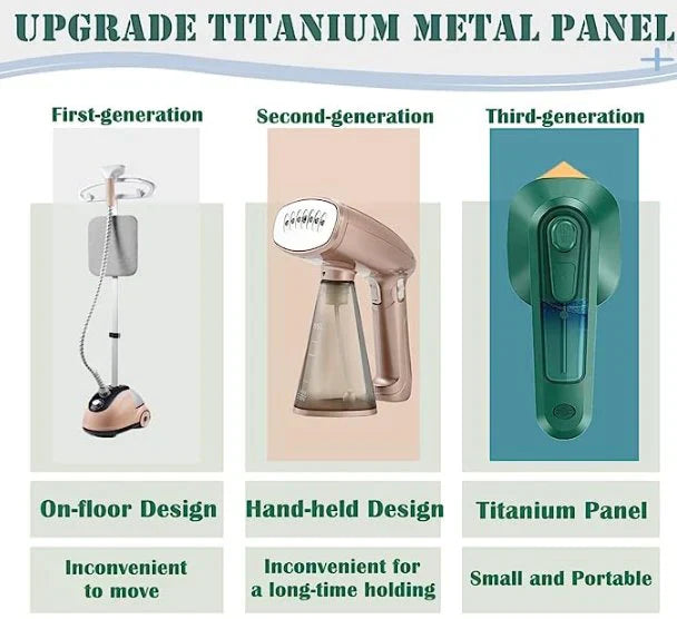لوحة معدنية من التيتانيوم المُحسّنة: مكواة البخار للملابس مصنوعة من لوح تيتانيوم كبير، وتُكوى على درجة حرارة ثابتة تبلغ 150 درجة فهرنهايت، وتُسخّن مسبقًا بسرعة، وتُكوى بسلاسة. تخترق المكواة كل ألياف الملابس بسهولة، ما يُعيدها إلى حالتها الأصلية بسرعة، حتى الأقمشة الثمينة يُمكن العناية بها بعناية دون إتلافها.